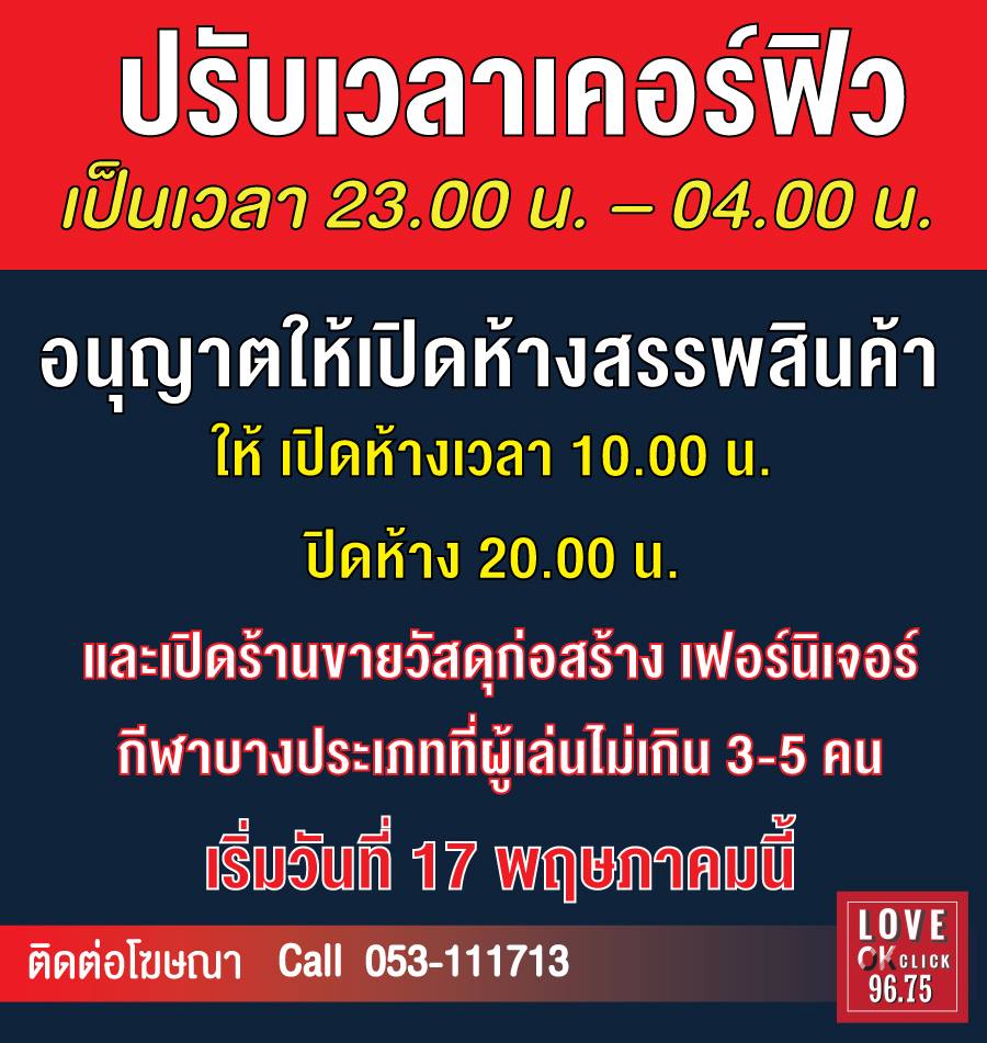 ปรับเวลาเคอร์ฟิว เป็นเวลา 23.00 น. – 04.00 น. 15/05/2020 Facebook Twitter Google+ Pinterest WhatsApp 📢📢ปรับเวลาเคอร์ฟิว เป็นเวลา 23.00 น. – 04.00 น. อนุญาตให้เปิดห้างสรรพสินค้า ให้เปิดห้างเวลา 10.00 น. ปิดห้าง 20.00 น. และเปิดร้านขายวัสดุก่อสร้าง เฟอร์นิเจอร์ กีฬาบางประเภทที่ผู้เล่นไม่เกิน 3-5 คน 🙌 เริ่มวันที่ 17 พฤษภาคมนี้