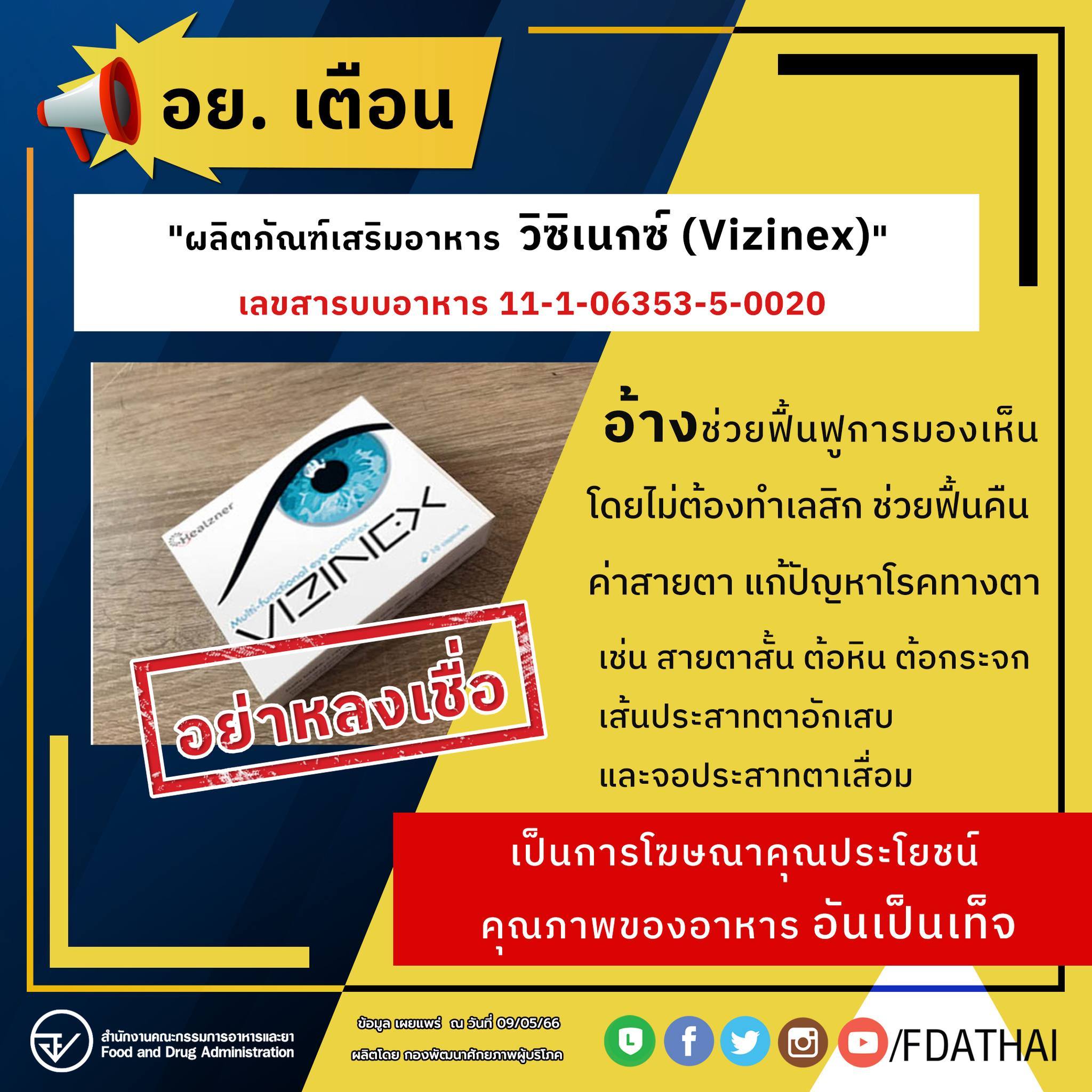 อย. เตือน ผลิตภัณฑ์เสริมอาหาร วิซิแนกซ์ (Vizinex) เลขอย. 11-1-06353-5-0020 แสดงภาพผลิตภัณฑ์และ ข้อความ ช่วยฟื้นฟูการมองเห็นโดยไม่ต้องทำเลสิก ช่วยฟื้นคืนค่าสายตาได้ถึง 95-100% ผลิตภัณฑ์นี้ใช้ในการแก้ปัญหาโรค ทางตาเช่น สายตาสั้น ต้อหิน ต้อกระจก เส้นประสาทตาอักเสบ จอประสาทตาเสื่อม และโรคตาอื่นๆ ” อย. ตรวจสอบแล้ว “เป็นการโฆษณาคุณประโยชน์ คุณภาพ ของอาหารอันเป็นเท็จโดยไม่สมควร เตือนประชาชนอย่าหลงเชื่อ