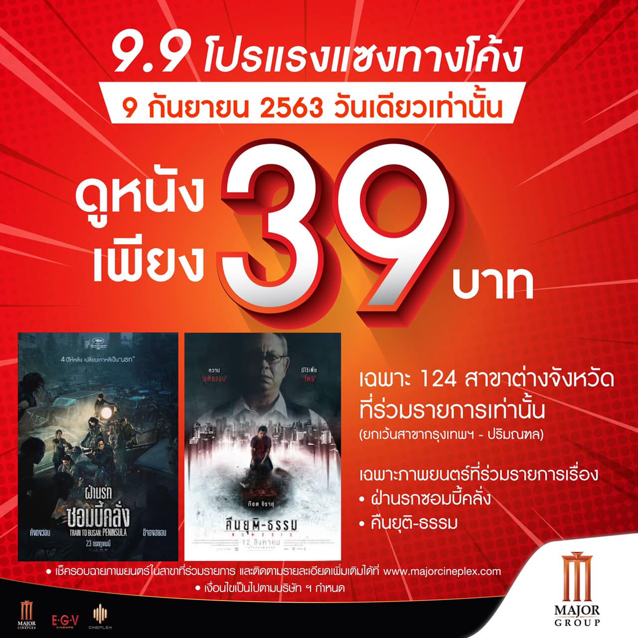 ⚡️⚡️ ดูหนังเพียง 39 บาท เรื่อง ฝ่านรกซอมบี้คลั่ง และ คืนยุติ-ธรรมเฉพาะวันที่ 9 กันยายน 2563 วันเดียวเท่านั้น!! ที่โรงภาพยนตร์ในเครือเมเจอร์ ซีนีเพล็กซ์ เฉพาะสาขาต่างจังหวัด 124 สาขาที่ร่วมรายการเท่านั้น (ยกเว้น กรุงเทพฯ-ปริมณฑล)