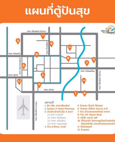 📌จุดที่ 1 ตึก PDL สาขา เชียงใหม่ 📌จุดที่ 2 ร้าน All About Beef ช้างม่อย 📌จุดที่ 3 ร้านกำไล สันติธรรม 📌จุดที่ 4 ร้าน Hakone Cafe สี่แยกหนองหอย 📌จุดที่ 5 ร้านอำนวยมอเตอร์แอร์ สาขา 1 📌จุดทึ่ 6 โรงแรมซีมอร์ เจ็ดยอด และ 📌จุดที่ 7 ร้านข้าวจ้าวข้าวนึ่ง 4 สาขา จุดที่ 11 ร้านนมบางกรวย สาขานิมมาน